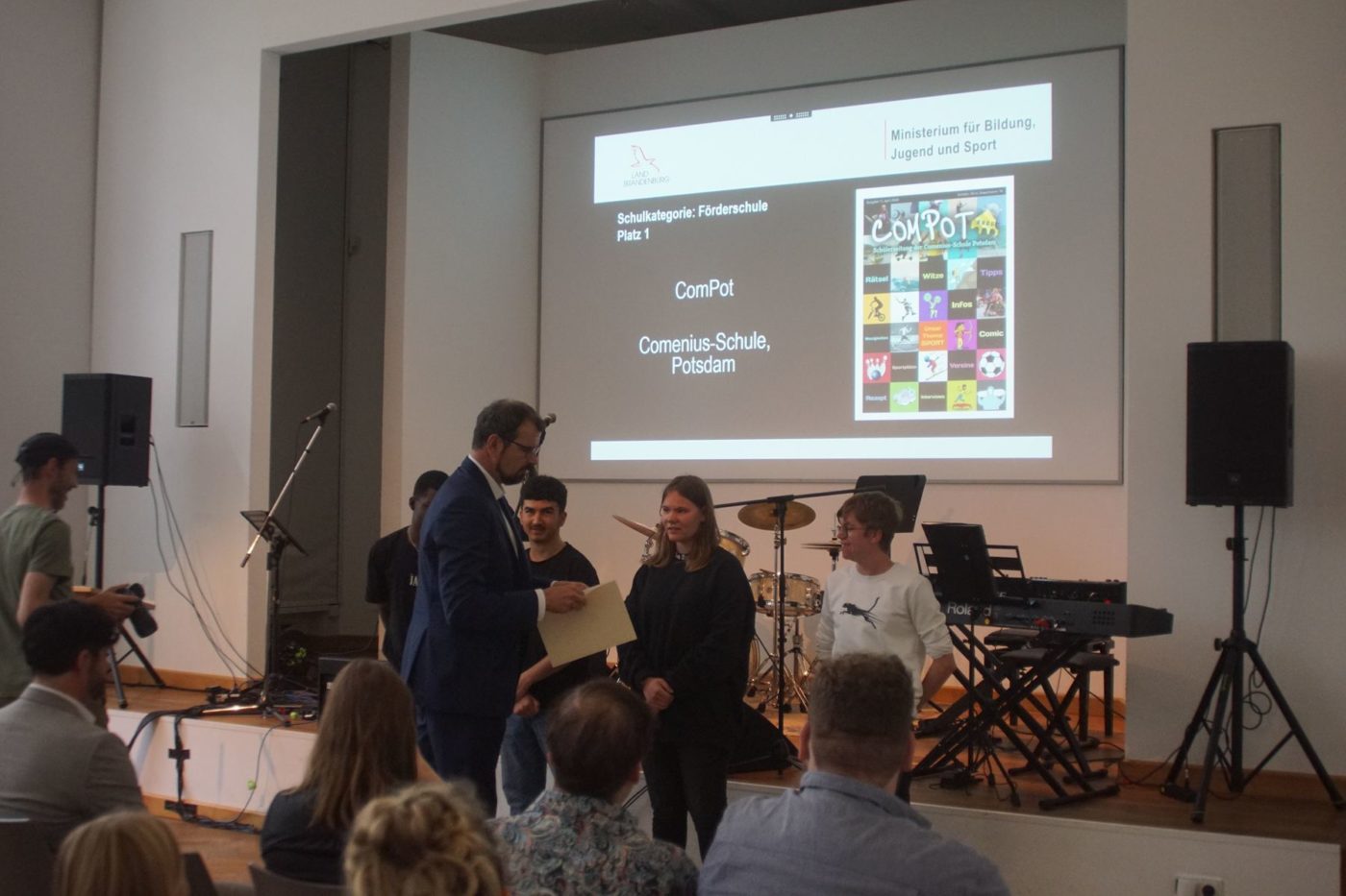 Doch dann wurden wir aufgerufen! Unter den Förderschulen gewannen wir den ersten Preis! Um genau zu sein: unsere ComPot Nummer 11 wurde prämiert. Das war die Ausgabe mit dem Thema Sport. Wir waren ganz schön aufgeregt und haben uns sehr gefreut. Es gab sogar ein Preisgeld von 500€ und ein leckeres Bufett!